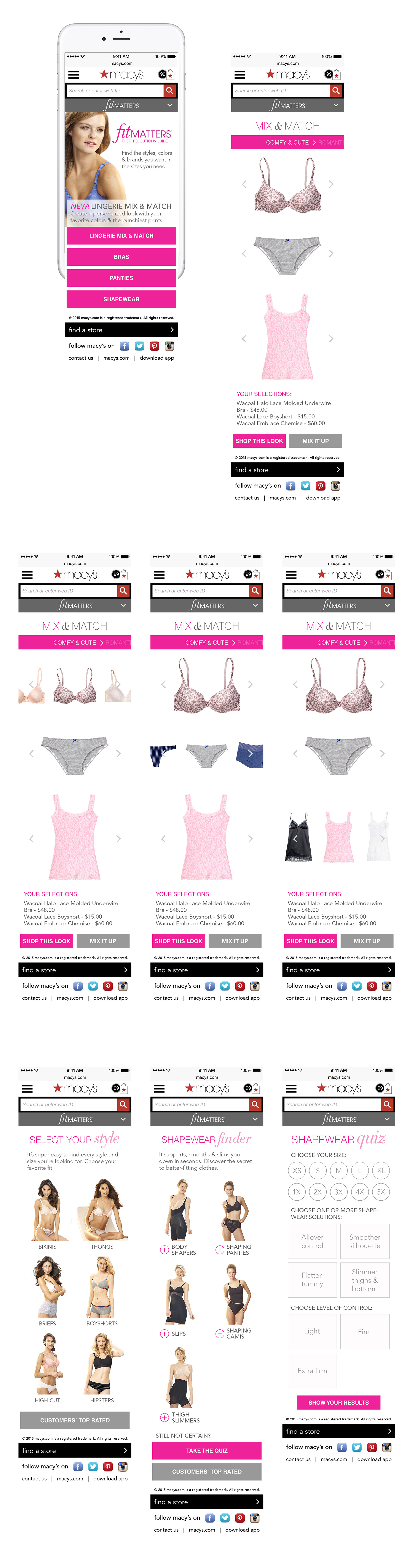 Design for the Macy's Fit Matters mobile marketing sitelet. First to design and customize this mix and match experience for Macy's mobile web. Worked in tandem with developers for the best user experience.